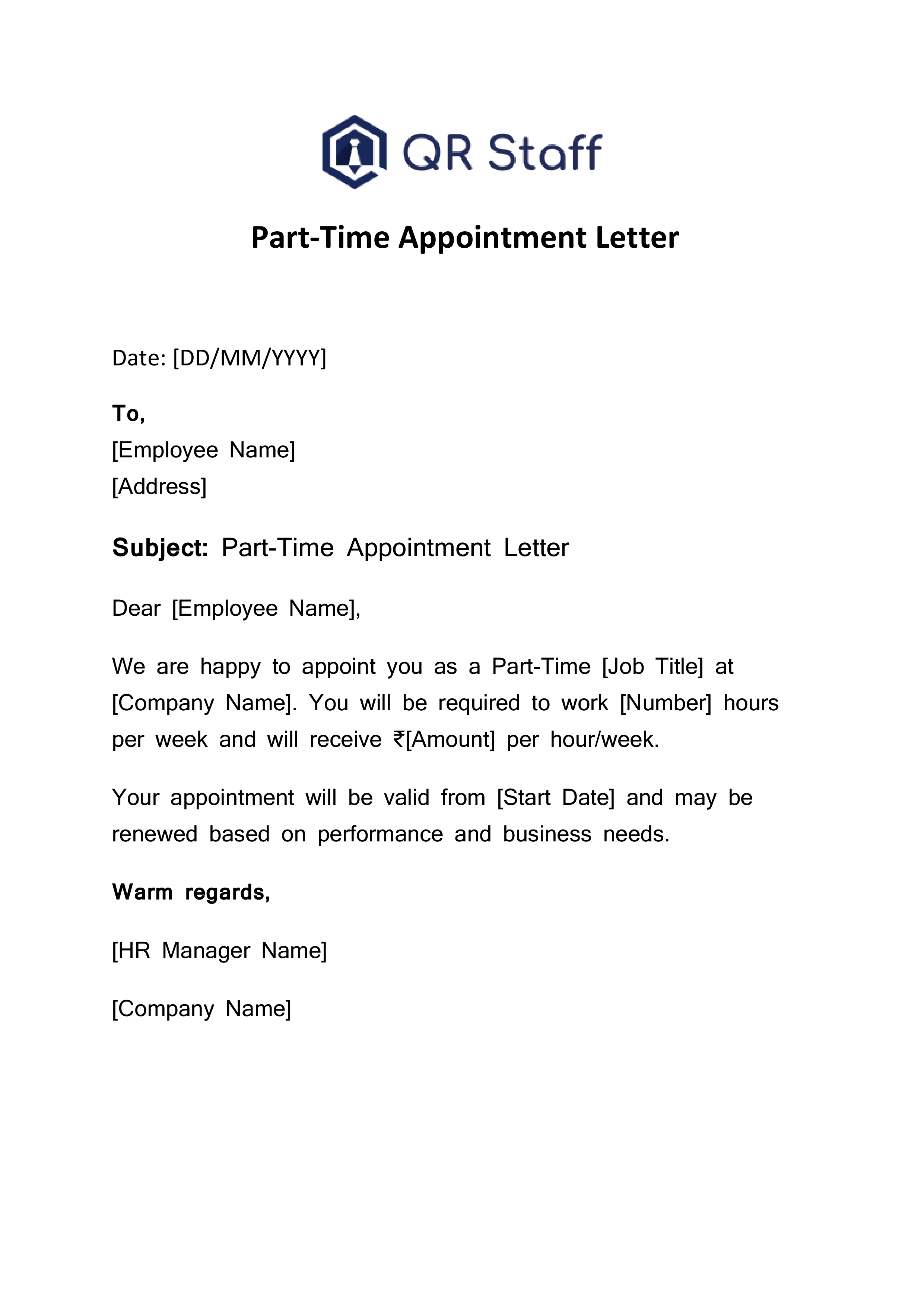 A Part-Time Appointment Letter is given to employees who work fewer hours than their full-time counterparts. This type of letter is often used for freelancers, consultants, or support staff.