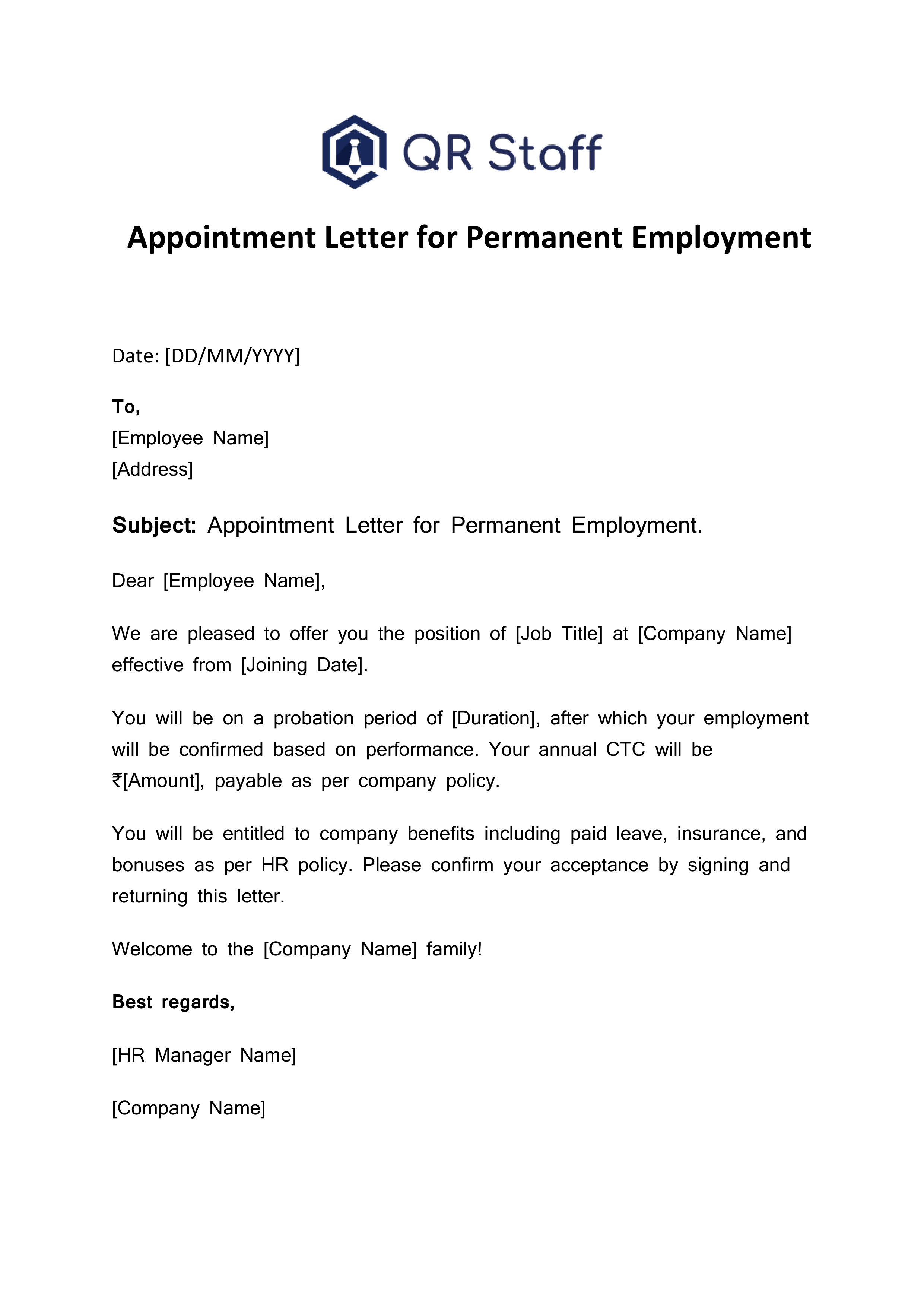 A Permanent Appointment Letter is given to an employee who is brought on board for a long-term role that doesn’t have a set end date. This letter signifies the company’s dedication and ongoing relationship with the employee. It includes important information such as the job title, salary, working hours, and the terms of employment.