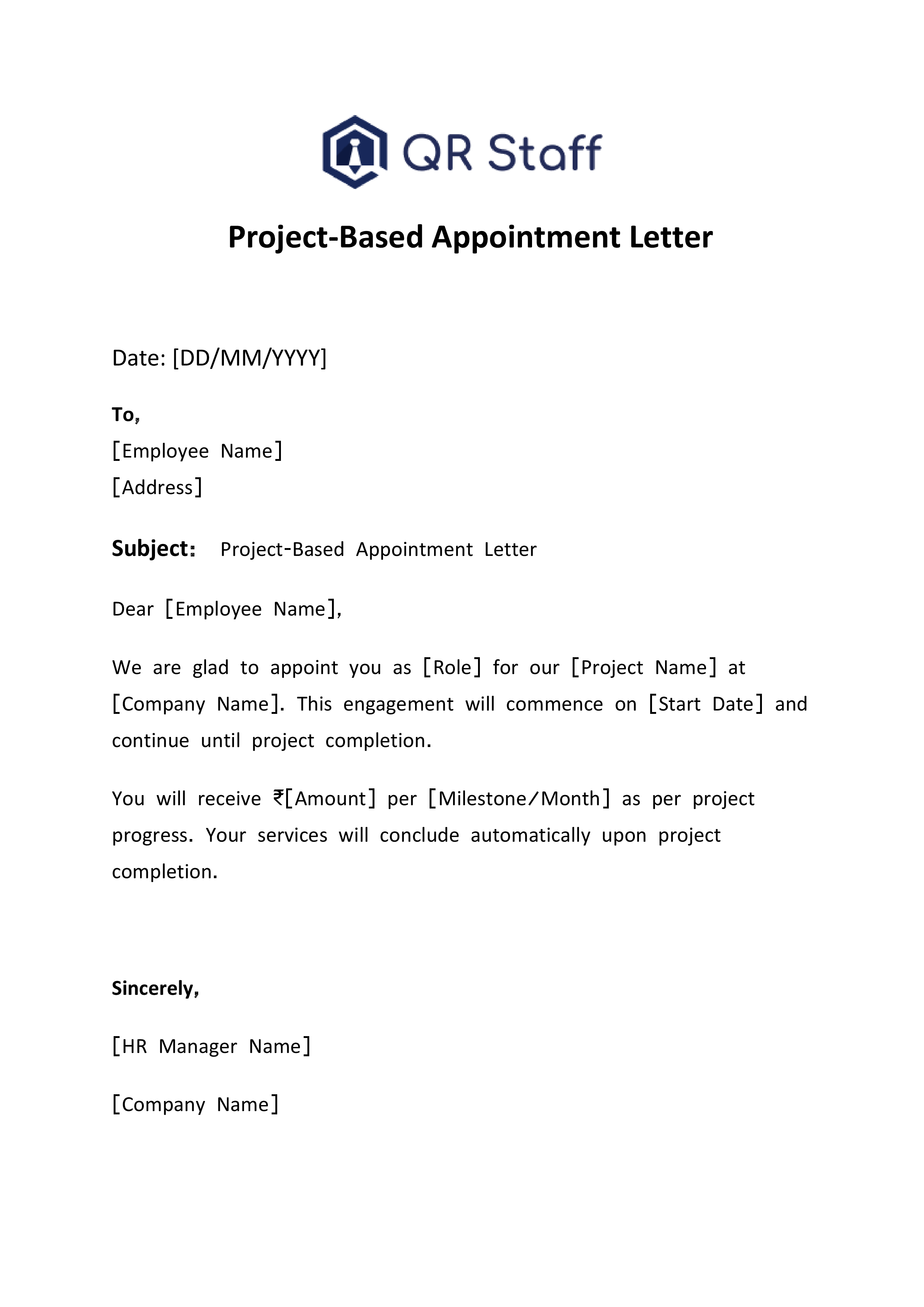 A Project-Based Appointment Letter is awarded when a freelancer or an employee is engaged for a particular project instead of a predetermined period of employment.