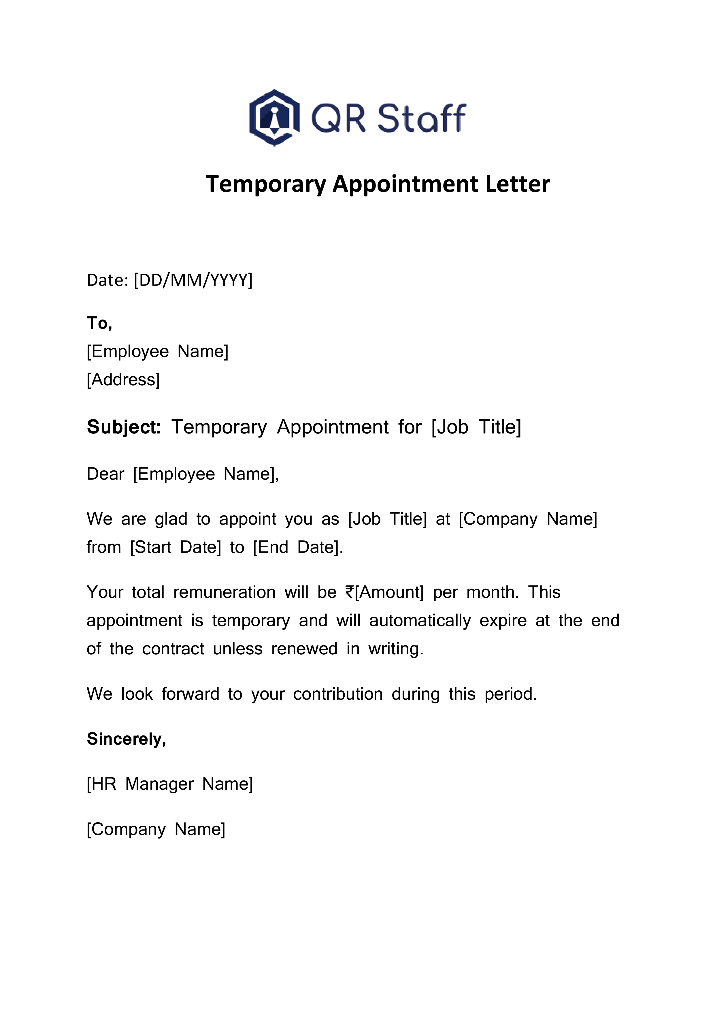 A Temporary Appointment Letter is issued when an employee is brought on board for a set period or a specific project. This kind of letter is often used for short-term contracts, internships, or seasonal jobs.